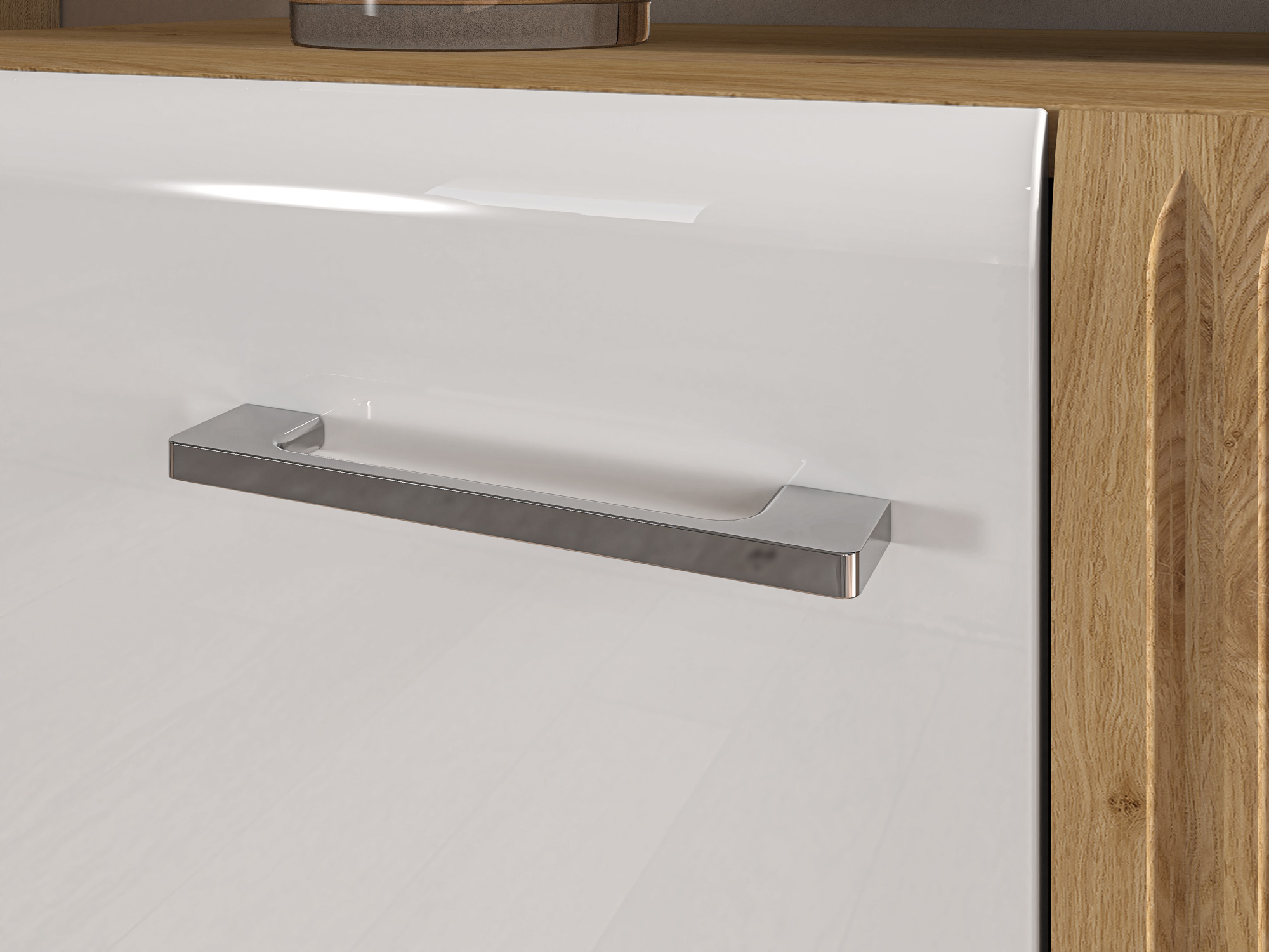 A spacious piece of furniture with a large top for displaying favorite items. Inside, there’s a shelf dividing the space into two large compartments. Four large drawers with reinforced bottoms provide ample space for towels, clothes, or other textiles. This furniture piece is ideal for the living room or bedroom, combining functionality and good design. Features include rounded MDF fronts, deeply grooved trims, metal and chrome handles, soft-closing hinges, increased drawer capacity, and full-extension drawer slides.